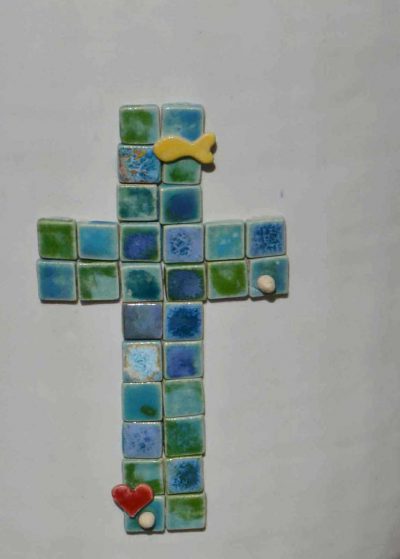 Diese kleine Urne für Kinder wurde liebevoll mit handgemachten Mosaiksteinchen verziert, welche alle aufwendig einzeln ausgeschnitten, geglättet und in Kleinstarbeit in verschiedenen Farben glasiert wurden. Diese Mosaikteilchen bilden nun ein farbenfrohes Kreuz. Auf das Kreuz wurden kleine niedliche Details aufgebracht, wie zum Beispiel ein Fisch und ein Herzchen.