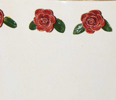 Dieses Unikat wurde auf der Scheibe frei gedreht und nach dem ersten Brand mit einer Glasur überzogen, welche verschiedene dezente Blautone vereint. Auf diese Oberfläche wurden anschließend liebevoll handgeformte Röschen aufgebracht. Diese wurden dann zusätzlich mit einigen kleinen grünen Blättern, welche mit perlmuttfarbenen Perlen verziert sind, umrahmt.