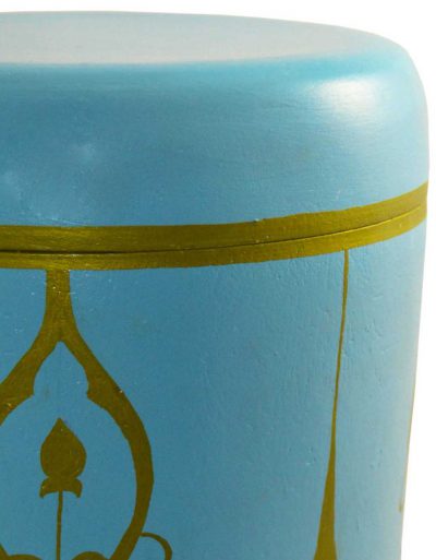 Auf dem zarten, hellblauen Hintergrund befinden sich edle, goldene Ornamente. Wie aus einer anderen Zeit, wirkt diese Urne, welche mit Acrylfarbe bemalt wurde.