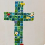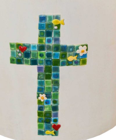 Diese Urne wurde liebevoll mit handgemachten Mosaiksteinchen verziert, welche alle aufwendig einzeln ausgeschnitten, geglättet und in Kleinstarbeit in verschiedenen Farben glasiert wurden. Diese Mosaikteilchen bilden nun ein farbenfrohes Kreuz. Auf das Kreuz wurden kleine niedliche Details aufgebracht, wie zum Beispiel ein Fisch und ein Herzchen.